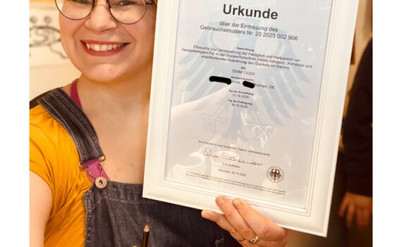Ein Gebrauchsmuster ist so etwas wie die kleine Schwester vom Patent. Und deswegen hängt seit gestern ein Bundesadler in meinem Atelier :o) Ist das nicht verrückt? Ich kann es selbst kaum glauben – mein Filzwachs ist jetzt offiziell beim Deutschen Patent- und Markenamt (DPMA) als Gebrauchsmuster eingetragen! Seit meiner Kindheit habe ich davon geträumt, Erfinderin zu werden […]