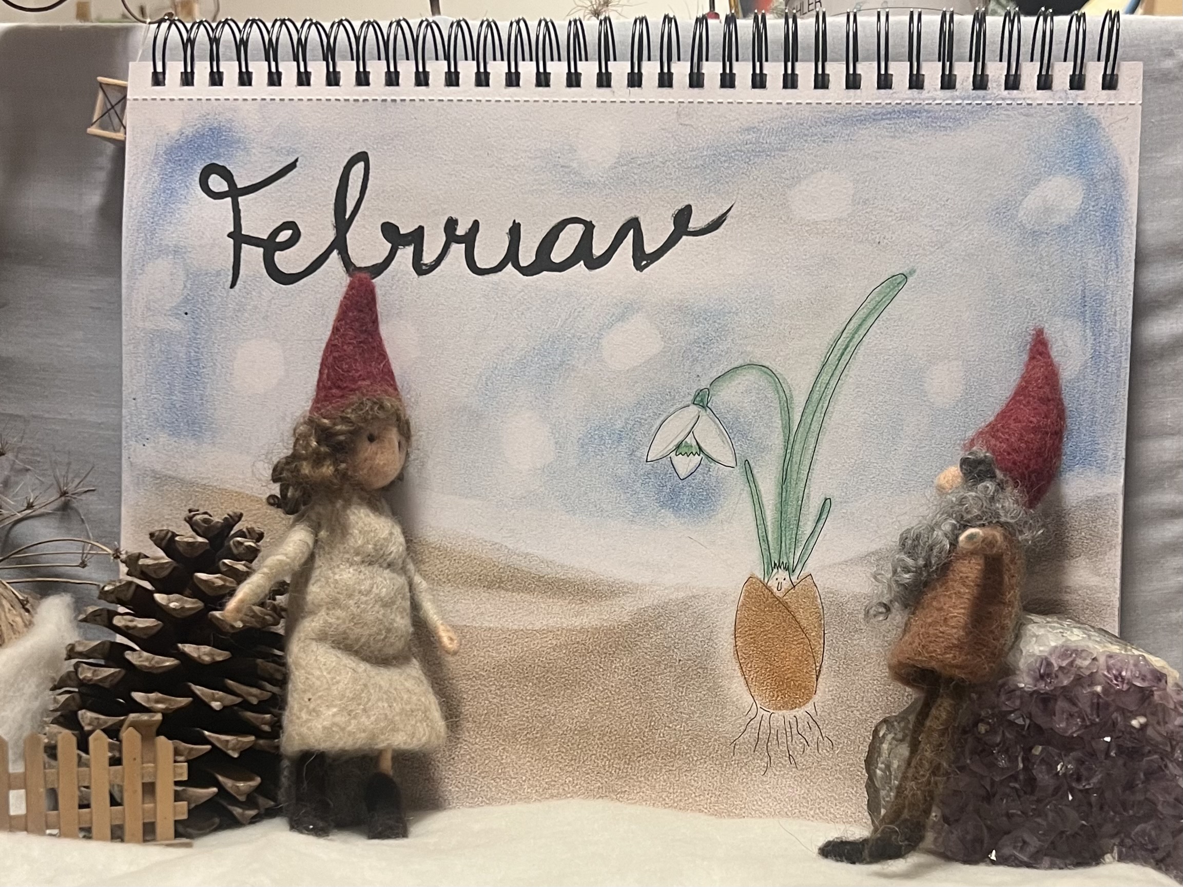 Für das Kalenderblatt dieses Monats malen wir ein Schneeglöckchen, das aus einer kleinen Zwiebel durch Erde und Schnee in den graublauen Winterhimmel wächst. Ein Bild, bei dem man genauer hinschauen darf – denn in der Zwiebel hat sich ein kleines Detail versteckt.